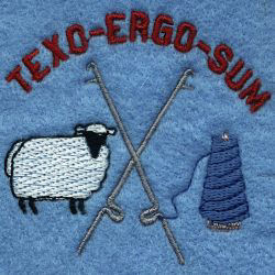 Texo Ergo Sum (I Knit, therefore I am) is the logo that was designed by Barbara Logan and myself. It was modelled on the writing of the philosopher Descartes who wrote, “I Think; Therefore I Am.” The motto really expresses my thoughts when it comes to knitting. What started out as a hobby then turned into a few designs with their patterns commissioned by yarn companies.